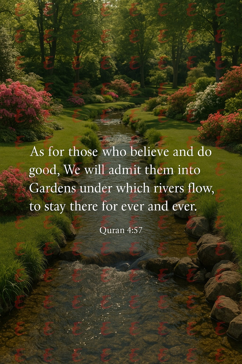 "As for those who believe and do good, We will admit them into Gardens under which rivers flow, to stay there for ever and ever." Quran 4:57