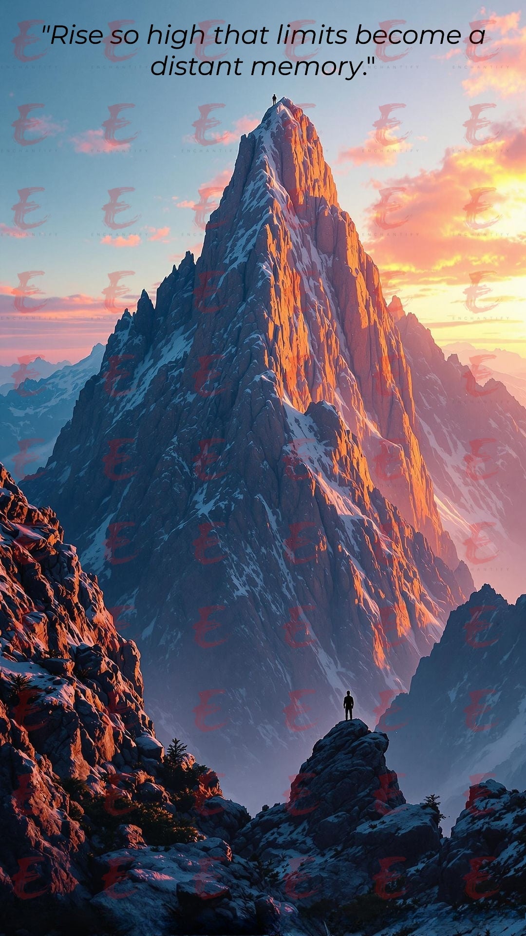 Limits? They’re just checkpoints on the way to greatness. This electrifying artwork captures the essence of unstoppable ambition - a lone figure standing triumphantly atop a towering mountain, bathed in the golden glow of possibility. Every glance at this piece will remind you that your potential is limitless - you just have to keep rising.