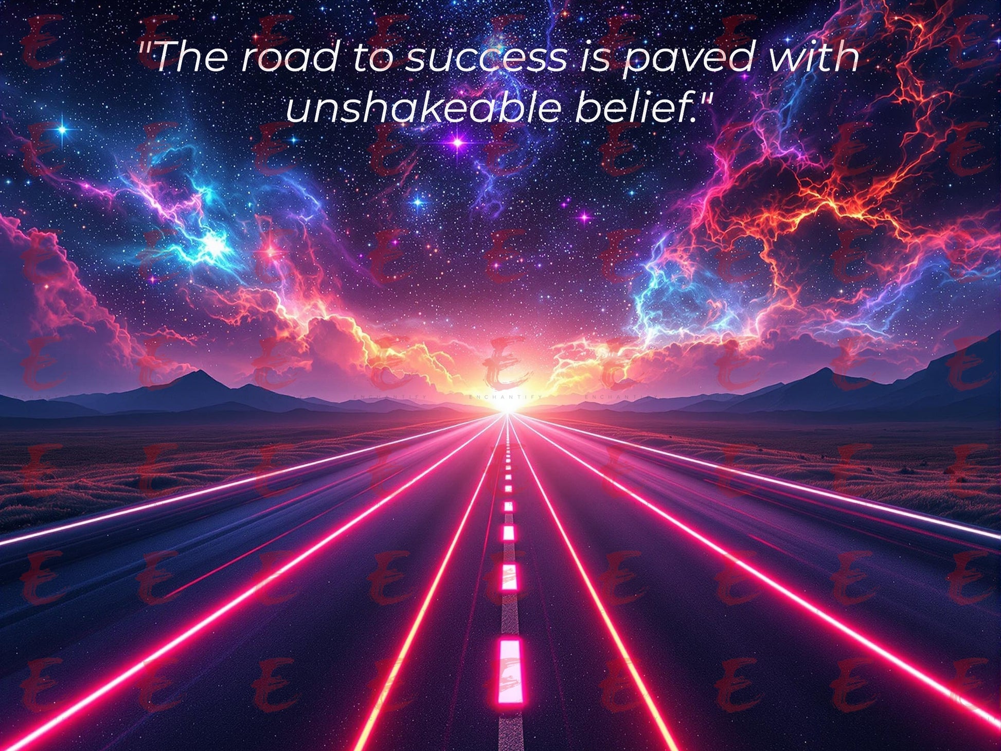 Every great success story starts with one thing - belief. Not just any belief, but the kind that never wavers, never doubts, and never backs down. This powerful artwork captures the journey of ambition, featuring a futuristic, neon-lit highway stretching endlessly into the horizon - a bold symbol of determination, resilience, and the limitless possibilities ahead.